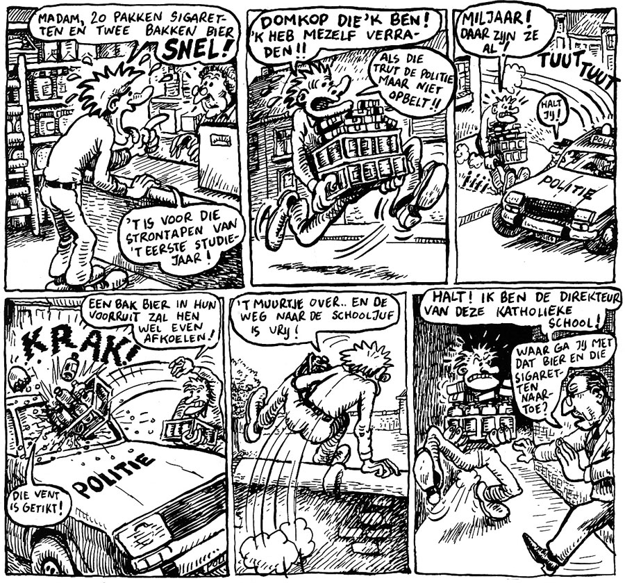 When one of his St. Lucas teachers showed him underground comix by Dutch cartoonist Willem, Verhaegen was inspired to create more biting, alternative comics himself. The student found an outlet in the adult magazine Spetters, The publisher Jan Bucquoy was a provocative anarchist, who allowed his writers and artists to go very far in their subject matter. While Verhaegen later commented that Bucquoy "still owed him money", he also enjoyed the creative freedom Spetters gave him. As a recurring character, Verhaegen came up with Fil Marver, who was in many ways an alter ego of the artist. A spiky-haired punk who frequently breaks the law, Fil could do and say things that Verhaegen didn't dare. Fil Marver's adventures are drawn in a gritty, black-and-white style, inspired by Robert Crumb. Writing the plots together with his friend Eric Leeraar, Verhaegen assumed the pen name "Marver" (sometimes "Stan Marver"), a contraction of the first three letters of his first and last name. After serialization in 1981 and 1982 in Spetters, the 'Fil Marver' stories were collected in the comic albums 'De Ongrijpbare Fil Marver' (Shark, 1982), 'The One and Only Fil Marver' (Zinjé, 1985) and 'Blikschade' (Zinjé, 1987).