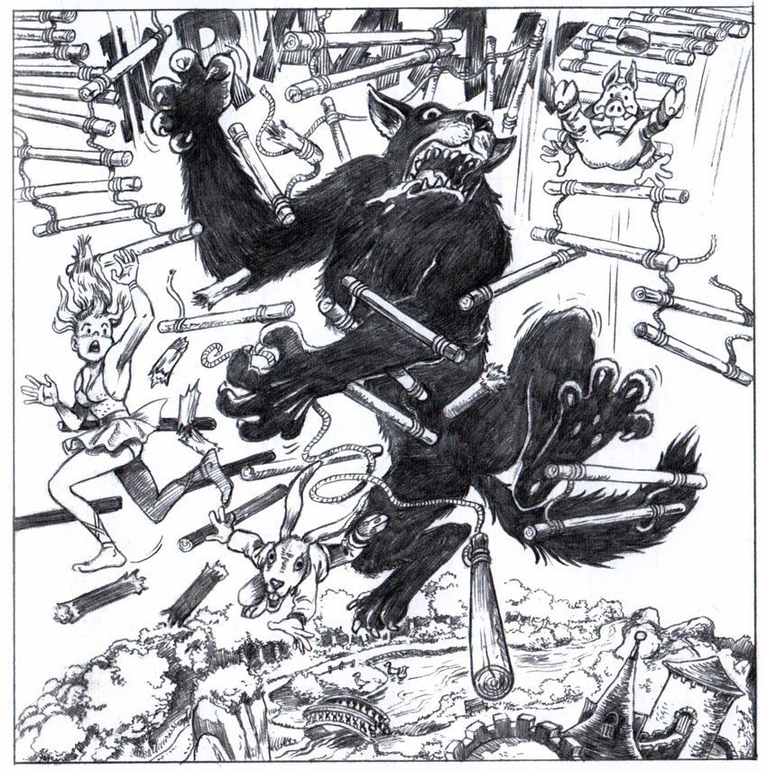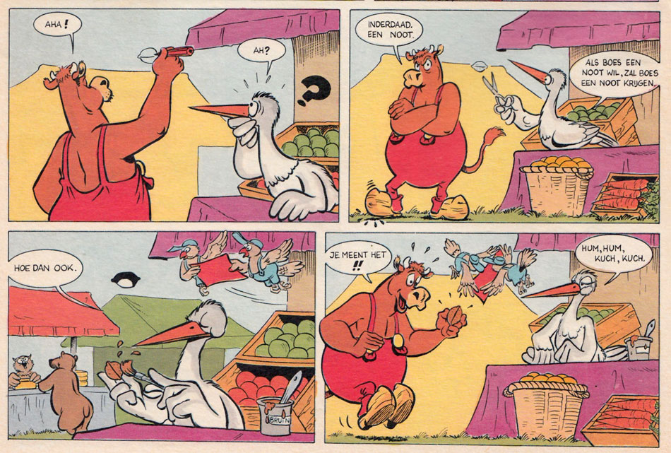 Since the original newspaper strip consisted of pantomime visual gags involving all sorts of animals with no specific plot or secondary cast, the 'Boes' universe was expanded for the TV show. Besides more consistent storylines, the cartoons also featured prominent secondary characters, including Dolly the tortoise (Jack in English), Saffie the dog (Sammy) and Shampoo the gorilla (Gaylord). These characters were given larger roles in the comic books as well. In the full-length Studio Koala stories, Verhaegen's zany humor jumps off the pages. In total, three 'Boes' stories were produced by Marck Meul and his team: 'Een Harde Noot' (1988), 'Een Nieuw Erf' (1988) and 'De Schaapscheerder' (1989).