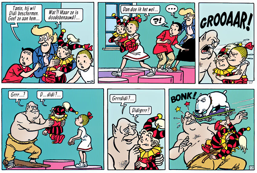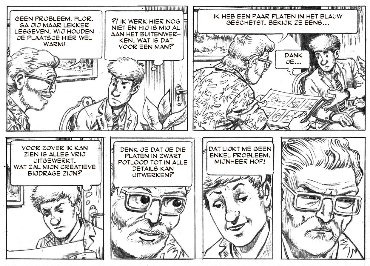 In January 1989, Verhaegen officially started his work on 'Suske en Wiske'. At first, he had to develop Paul Geerts' rough sketches into finished pencil drawings, beginning his work with strip 179 of the episode 'De Speelgoedspiegel'. Early on, however, the young man already contributed ideas for jokes and plotlines. The episode 'De Kleurenkladder' (1989-1990), for instance, features a near-sighted villain who was modeled after one of Verhaegen's friends, an early example of the artist's knack for inside jokes.