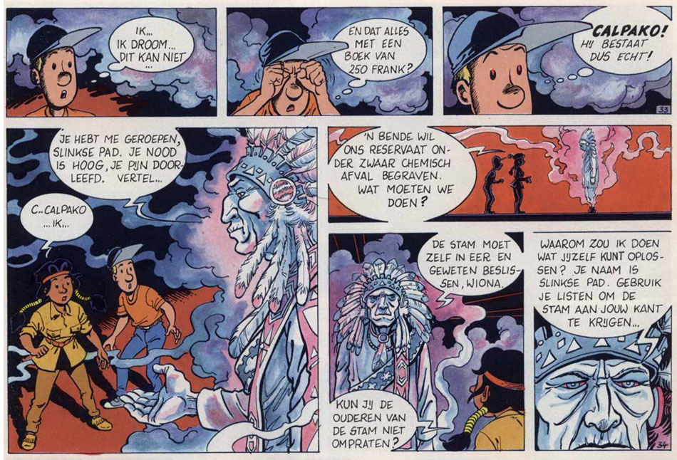 During his time at Studio Vandersteen, Verhaegen additionally received the chance to publish some of his own creations in Standaard Uitgeverij's weekly magazine Suske en Wiske Weekblad. His adventure series 'Calpako' (1996, 1998) starred a young, cap-wearing teenager, Josh, and his best friend Wiona, a Native American girl. Two stories were made, 'Wiona' (1996) and 'De Timucuabronnen' (1998). Under the pseudonym Xao Pi, Verhaegen also created the short-lived gag comic 'Ted en Fred' (1997), starring a short-sized chain smoker (Ted) and his tall and bald friend Fred. Most of their gags feature self-reflexive comedy. The characters are followed by an eraser who will destroy them if they fail to be funny.