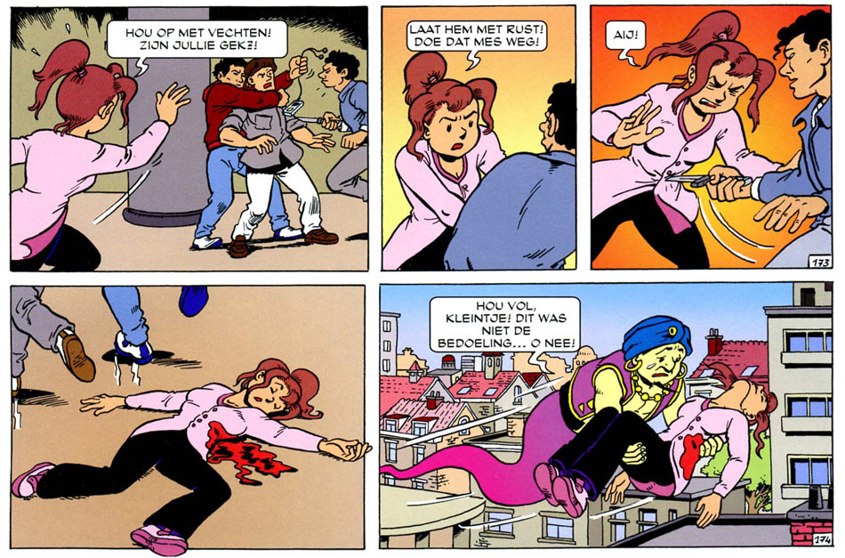 A true "enfant terrible", Verhaegen tested how far he could go with his storylines. In Vandersteen's will it was stated that sex, drugs, religion and racism were taboo topics. The series' creator also insisted that his characters weren't allowed to grow older and the characters Lambik and aunt Sidonia should never marry. However, within a few years since his passing, the series already started to derive from Vandersteens wishes. In 'De Stervende Ster' (1994), Aunt Sidonia lights a cigar, although she is later revealed to be an imposter. In 'De Stugge Stuyvesant' (2001), one character smokes a joint and Lambik and Jerom arrest a heroin dealer. In 'De Ongelooflijke Thomas' (2000-2001), the cast travels to the then-distant year 2020, where Lambik and Sidonia are not only married, but also have a son. By now demented seniors, they spend their days in a retirement home. In the end, the past is altered, so that these events will never occur. Nevertheless, long-time fans didn't react well to this story. It felt as if Verhaegen was deliberately trolling his audience and violating Vandersteen's will. However, interviewed by Koen Maas in De Perfecte Podcast (March 2021), Verhaegen claimed that he never knew what Vandersteen's will exactly said, except for a few excerpts. Still, Vandersteen's will was widely published in many books and press articles at the time. For somebody who continued 'Suske en Wiske' for several years, it seems unlikely that he was never fully briefed about these matters. Given how many scenes were direct violations, it cannot be dismissed as mere coincidence.