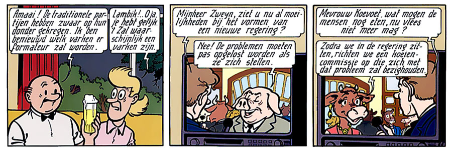 Suske en Wiske #268 - 'De Koeiencommissie' (2000). The pig, Dick Zweyn, is a metaphor for Belgian Prime Minister Jean-Luc Dehaene. Dehaene was a corpulent man, who tended to dismiss journalists' questions about potential crises with the motto: "Problems ought to be solved once they occur." The cow, Magda Koevoet, refers to politician Magda Aelvoet.