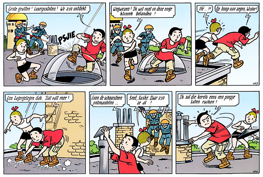 The weird and iconoclastic stories aside, several of Verhaegen's 'Suske en Wiske' stories fit well within the series' familiar, conventional hallmarks. Stories like 'De Pottenproever', 'De Vonkende Vuurman', 'Prachtige Pjotr' and 'Verraad op de Veluwe' are inspired by folklore tales. Others delve into environmental issues ('De Kernmonsters'), while other albums promote huge media events. 'Big Mother' (2001) cashed in on the popular reality TV show 'Big Brother', while 'De Blote Belg' (2001) ran parallel with a similarly titled TV game show, broadcast on TV1. Like his predecessors, Verhaegen also worked on advertising stories with the characters. 'De Fleurige Floriade' (2001) promoted the annual Floriade gardening expos in the Dutch Haarlemmermeer, while 'De Razende Rentmeester' (2004) highlighted the Dutch city Zoetermeer. 'De Ludieke Les' (2002) was made for Levenslijn, with profits going to help child patients with cancer.
