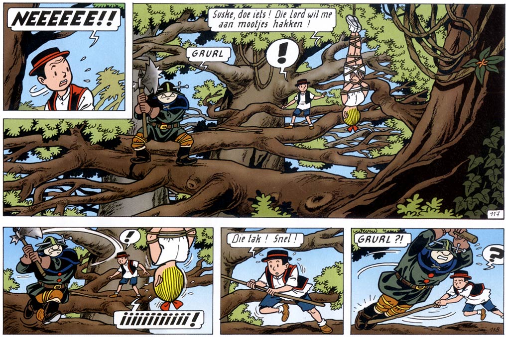 By the time Verhaegen became an employee of Studio Vandersteen, founder Willy Vandersteen was already in ill health. His signature comic 'Suske en Wiske' had been written and drawn by his successor Paul Geerts since 1972. In 1990, Vandersteen passed away. In his will, he stipulated strict guidelines for the continuation of the 'Suske en Wiske' series. His direct successor Paul Geerts always had the most respect for Vandersteen, a man he considered his mentor. Under his run, 'Suske en Wiske' remained true to Vandersteen's spirit and hallmarks. Already in the early years of Geerts' collaboration with Verhaegen, this led to creative differences. As a former animator and underground comic creator, he had a different background than most of his studio colleagues. Wanting to be more than just an anonymous factory artist, he was eager to innovate and desired to make unpredictable stories. Some of his suggestions were accepted. As Verhaegen felt that Suske was a bland character, he was allowed to make him more assertive. Paul Geerts also kept some of his assistant's wacky jokes in the stories. But at times, Verhaegen's humor went off track and he had to be whistled back. For instance, a page with morbid humor in the 1993 episode 'De Slimme Slapjanus', had to be redrawn. Longtime readers also noticed the change in style and were not always happy. These events motivated Geerts to temper Verhaegen a bit and keep the final say over his scripts.