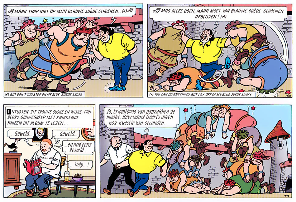 Pop music references and fan cameo in 'De Verdwenen Verteller' (Suske en Wiske #277, 2002).