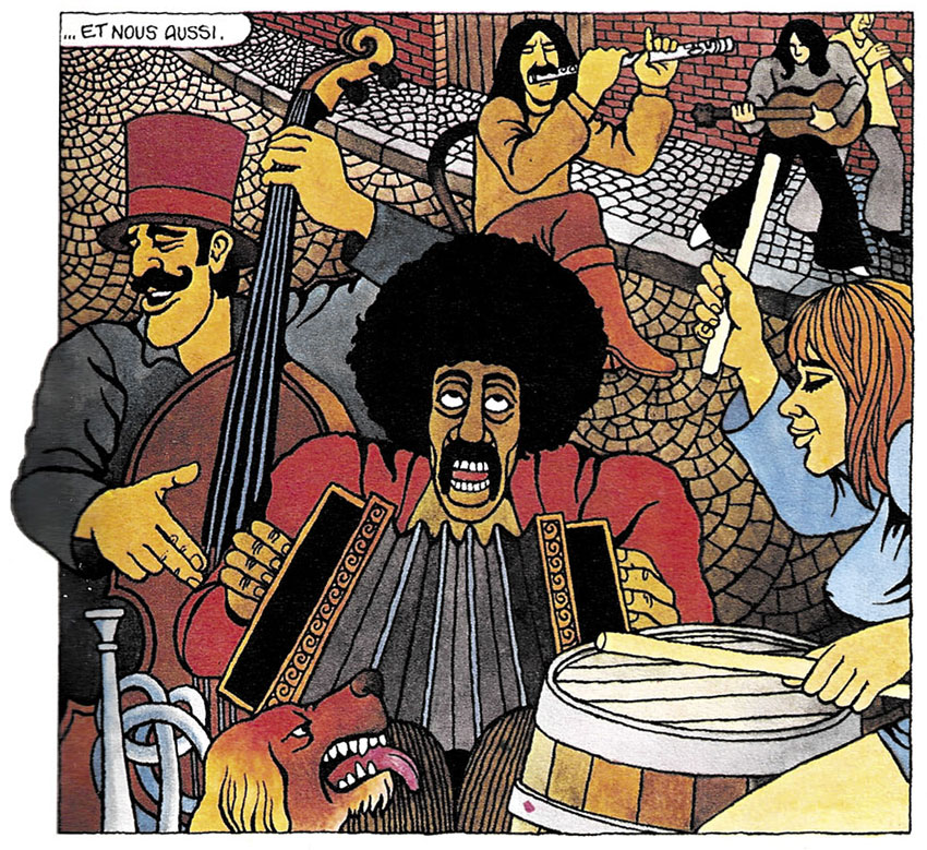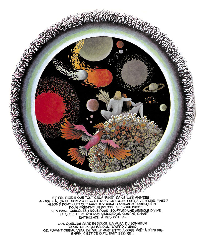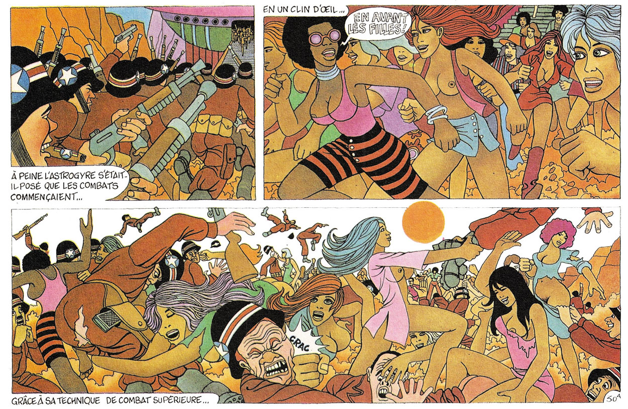 By the late 1960s, Vern left for Ibiza, but stayed in touch with Christin, AKA Linus. They made their first collaborative comic stories for Total Journal, a promotional comic magazine for Total petrol stations, edited by Christin and Jean-Claude Mézières for Benoît Gillain's advertising agency. From 1970 on, Pilote magazine regularly ran their short stories, as well as the serial 'Music Power Contre Machine Gang'. Drawn in a pop art style, these stories combined the authors' shared interest in music and utopian worldviews. In addition, Vern also illustrated a couple of stories scripted by Jacques Lob. Dargaud collected Vern and Christin's short stories in the albums 'En Douce le Bonheur' ("Happiness on the Sly", 1978) and 'Sixties Nostalgia' (Dargaud, 1983).