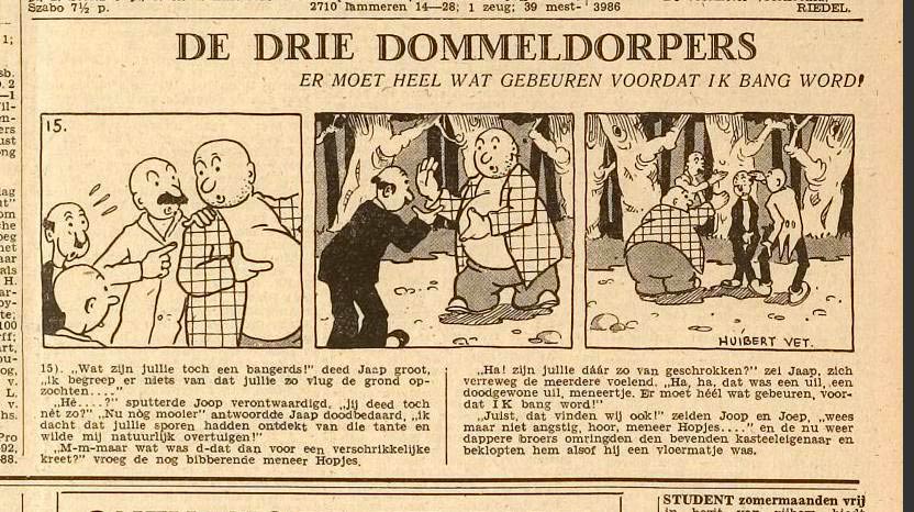 Huibert Vet (Huibert Arnoldus de Vet) was a Dutch comic artist and illustrator, born in Leiden. During World War II he falsified identity cards and after the War, he made comics and illustrations for Het Vrije Volk, De Groene Amsterdammer and the predecessor of the railway magazine Tussen de Rails. His comic strip 'De Dompeldorpers' was published in the local newspaper Leidsch Dagblad between May and September 1946.