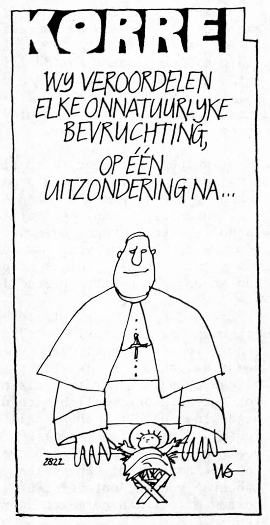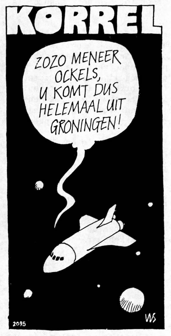 Two episodes of 'Korrel'. The first cartoon dates from 1986 and features the first Dutchman in space, Wubbo Ockels, who is addressed with the remark: "Well, well, Mr. Ockels, you came all the way from Groningen!" The joke references a remark many people from Groningen (like Ockels, who was born there) hear regularly, according to Visscher. The second cartoon is from a later date and features a Catholic priest next to baby Jesus: "We condemn every unnatural conception, except for one."