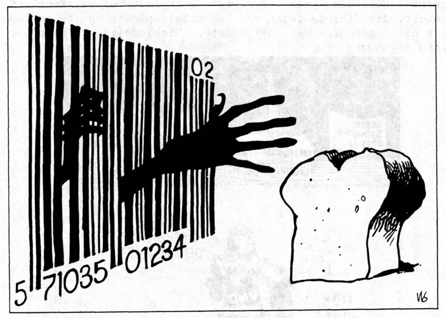 From 1982 on, Visscher also made drawings for the Catholic monthly Bijeen, that focused on poverty and development aid. A 1983 cartoon about the topic "world hunger" became his most famous and reprinted drawing. It depicts a poor black African imprisoned inside a bar code, trying to reach for a piece of bread. A year later, it won Visscher the 1984 Grand Prix, handed out by the International Salon of Caricature in Montreal, Canada.