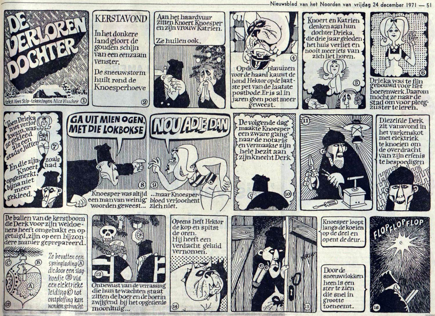 On 24 December 1971, Nieuwsblad van het Noorden additionally printed a one-shot comic by Visscher and Kees Stip: the contemporary Christmas story 'De Verloren Dochter' ("The Lost Daughter"), about farmer Knoert Knoesper, whose voluptuous daughter Drieka returns from the city.