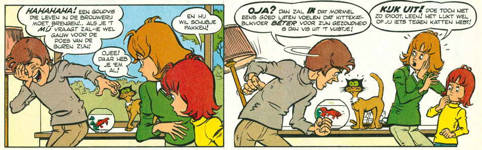 The 1970s also marked the return of Dick Vlottes as an allround comic creator, this time for the girls' magazine Tina, that had just started its own comic story production. Between 1973 and 1977, he made six stories of 'Ineke van Rijswijk', about a young shop assistant in a department store. The first two stories were written by Will Heiens, the others by Vlottes himself. Between 1976 and 1981, he also contributed irregularly appearing gag pages with 'Leonie, het Horoscoopmeisje', about a girl fascinated with her daily horoscope.