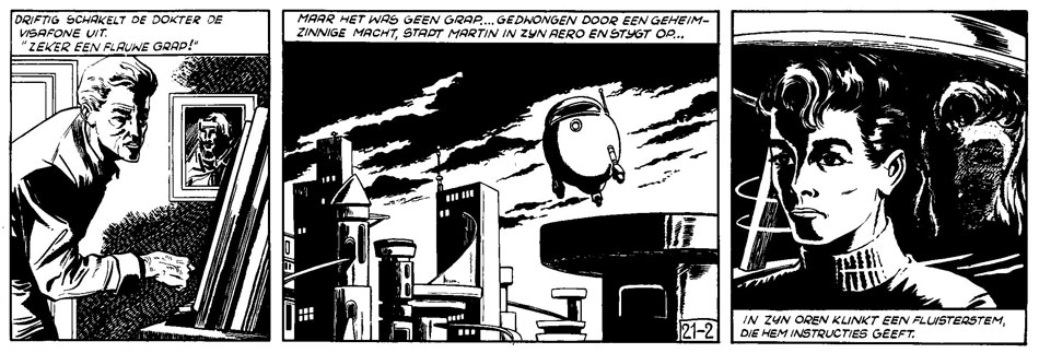One of Dick Vlottes' first studio assignments was the science fiction newspaper comic 'Martin Evans', written by Lo Hartog van Banda. During its first 1955 serialization in Scandinavian newspapers, the debut story 'Het Venuskruid' was drawn by Ben Abas (strips #1 through 100) and finished by an unknown studio worker (strips #101 through 104). For the 1958 reprint in Dutch newspaper De Stem, penciler Thé Tjong-Khing and inker Dick Vlottes redid the final four strips. After that, Vlottes penciled and inked the sequel story, 'De Zerovaart' (3 January through 7 April 1959). A third and fourth story were then drawn by Gerrit Stapel, from scripts by Hartog van Banda and Harry van den Eerenbeemt.