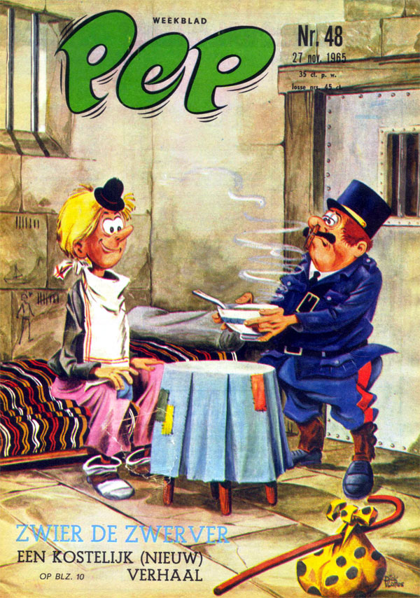 Cover drawings for Pep issues #27 and #48 of 1965, starring Dino Attanasio's 'Spaghetti' and Jean Tabary's 'Valentin le Vagabond'.