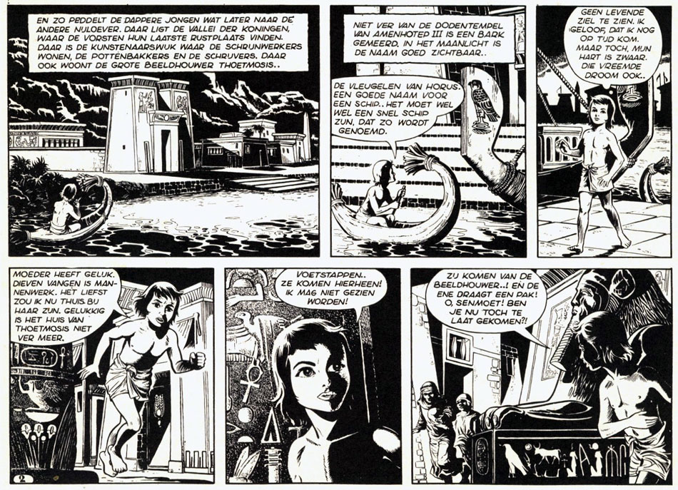 While 'Botje Boon' was still running, the Olidin editors asked Vlottes for another comic. This became 'Senmoet de Egyptenaar' (1963-1966), a historical balloon comic set near the end of the 18th Dynasty of Ancient Egypt, starring the poor sailor Achat and his young son Senmoet. Contrary to 'Botje Boon' - with its semi-caricatural drawing style and large-head characters - 'Senmoet' was fully realistic, well-documented and highly detailed. Interested in Egypt since his early childhood, the country and its history were recurring themes in Vlottes' comics and paintings throughout his life. He wrote and drew the series all on his own. Vlottes took great care in its historical accuracy, taking much inspiration from the 1945 historical fiction novel 'Sinuhe the Egyptian' by the Finnish writer Mika Waltari. Funny enough, another Dutch comic artist, Bert Bus, was inspired by the same book for the creation of his comic series in Sjors magazine, 'Theban' (1957-1959). At the time, the two artists were not aware of each other, realizing only later that they had made "almost exactly the same comic" (as Bus recalled in Stripschrift issue #87). Years later, Vlottes and Bus decided to join their forces in their shared love for Ancient Egypt, but the planned comic project never saw the light.