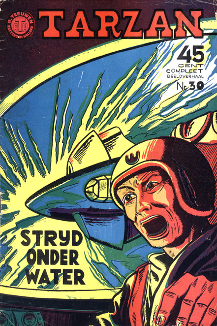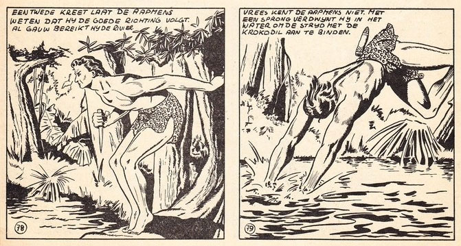 Since he always enjoyed drawing 'Tarzan', Vlottes tried to sell a homemade comic story with the famous jungle hero to ATH, a Rotterdam-based publishing house of so-called "beeldromans". These were pulpy picture novels, filled with action and adventure. Head of ATH was Arnoldus Teeuwen, who bought Vlottes' story and assigned the young cartoonist to write and draw a monthly 'Tarzan' comic book. Between 1955 and 1958, Vlottes drew 43 adventures with the vine-swinging jungle hero, assisted by the teenage cartoonist Albert Survie for the art and his wife Dini Scheffer for the lettering. Much of his imagery was based on Burne Hogarth's 'Tarzan' stories. Only 42 of his stories were released, though. In 1958, ATH was sued by the estate of 'Tarzan' author Edgar Rice Burroughs for bringing out unauthorized versions of the famous literary character. The case was settled and ATH was allowed to release new 'Tarzan' comics, with parts of the profits going to the Burroughs' heirs and other right holders. However, the publisher was no longer allowed to run the locally produced material by Dick Vlottes. Instead, the monthly books contained American reprints of stories by Bob Lubbers and and John Celardo, with cover drawings by Lou Visser.
