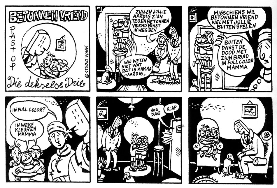 While 'Pastorale 83' gave Vonk some notability within the Dutch comics scene, his publications remained scarce and fragmented, for instance a couple of pages published in the comic magazines Titanic and Wordt Vervolgd. In the 1990s, Vonk appeared more regularly in the many indie magazines that arose during this period. His comics and cartoons were present in Bakkes, Posse, Gr'nn, Van Speijk and Incognito, and the cartoonist also participated in the latter magazine's chain comic 'Het Lieve Leven'. In 1994, he was a contributor to the very first issue of Zone 5300, a small press magazine from Rotterdam, initiated by Tonio van Vugt and Robert van der Kroft. To this day (2023), Zone 5300 has remained the regular homebase for Vonk's comic stories and three-panel gag strips.