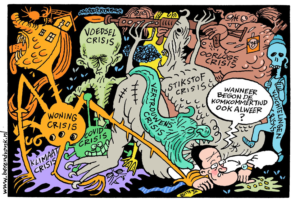 Cartoon for Binnenlands Bestuur (July 2022), about all the crises facing the Dutch government. Prime Minister Mark Rutte sighs: "Remind me, when does the off-season start?"