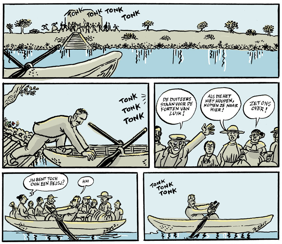 Despite periods of time living in the city of Amsterdam and the coastal town Noordwijk, Vonk and his family (a wife and four children) eventually returned to his Limburg roots and settled in Geulle, a town near Maastricht. In addition to illustrations for the regional newspaper De Limburger, Vonk also produces artwork for local events and companies. He has teamed up with other cartoonists from the region to do collective projects. Together with Marco Jeurissen, Jean Gouders, Gady Mirtenbaum and Toon Hezemans, he initiated the anthology 'Grenzenloos' (Tejohaas Productions, 2017), collecting forgotten stories and hidden histories from Limburg's border territory with Germany and Belgium. Vonk contributed a historical comic about a Limburg ferryman during World War I. The same collective then compiled 'Bevrijd' (Leon van Dorp, 2019), an anthology with true stories from before, during and after World War II. For this occasion, Vonk created a comic story based on his mother's wartime experiences. For the annual Dutch Mountain Film Festival in Heerlen, Vonk teamed up with graphic designer Roelant Meijer and festival director Toon Hezemans for the limited edition comic book 'De Fatale Reis van de Nevertought'. An illustrated captain's diary capturing the fatal trip of a sailboat heading for Franz Josef Land in 1898, the book was the first winner of the Small Press Award at the Haarlem Comic Festival 2022.