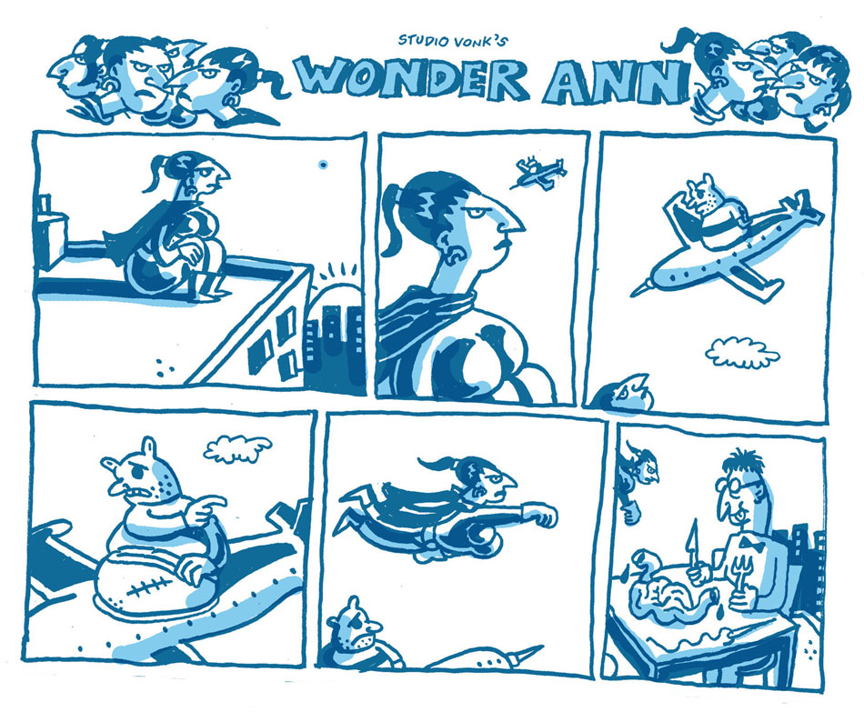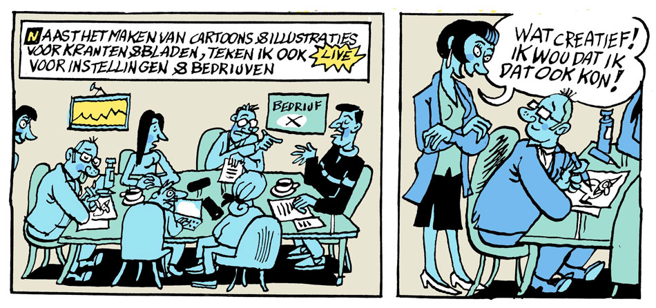 Besides comics, Berend Vonk also makes paintings as an outlet for his personal work, all in the same recognizable style. Most of his time is however dedicated to more financially rewarding activities like producing cartoons and illustrations for both the Dutch mainstream press and specialized or corporate magazines. Since the 1990s, he makes a weekly cartoon for the newspaper Trouw, in which he comments on the political news with a typical Vonk twist. Among his other regular clients have been the newspapers Algemeen Dagblad, Het Financieele Dagblad and De Limburger, magazines like VPRO Gids and Filosofie Magazine, the student paper Ad Valvas and the specialized magazines Boekblad and De Journalist (including its successor Villamedia). For the benefit claimants' monthly MUG, Vonk made cartoons with absurd predictions of the paths that Dutch social security could take. They were collected in the 1998 cartoon book 'Eens'. He also regularly contributes to Ser-bulletin, the house organ of the Social and Economic Council and the Labor Foundation, as well as Binnenlands Bestuur, a news magazine aimed at the highly educated civil servant and administrator. In 2018, he made the illustrations for the novel 'Braga Doom' by Joris van Os.