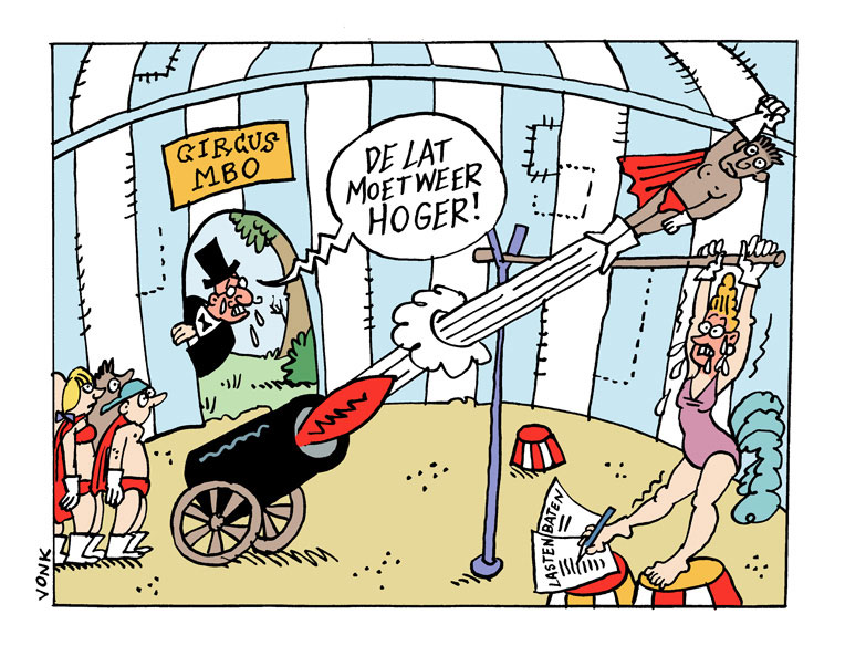 Cartoon about the demands for the Dutch practical education. "The bar must be raised again."