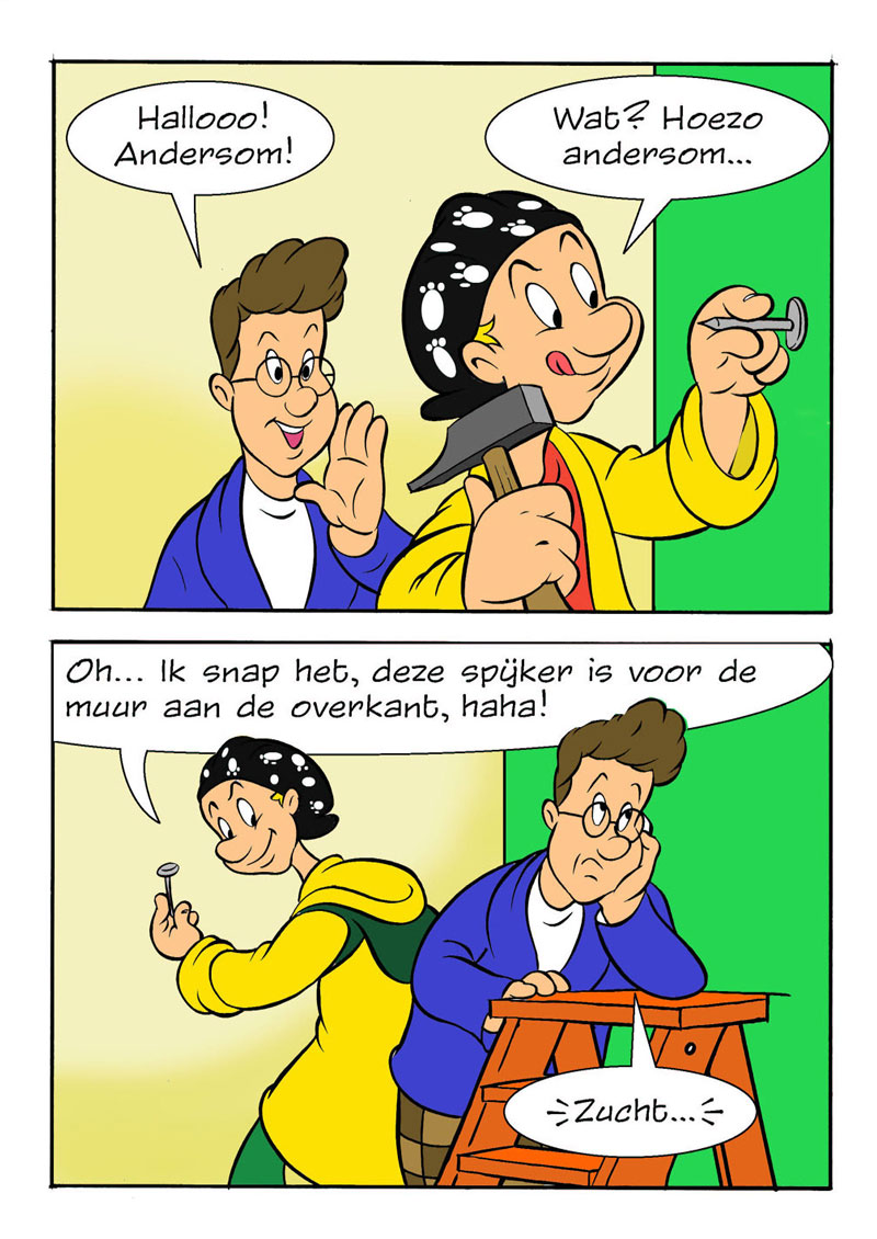 'Ernst, Bobbie & De Rest'. Translation: "Hello, the other way!" - "What do you mean: 'the other way'? Oh... I get it, this nail is for the wall on the opposite side, haha!' - 'Sigh...'.