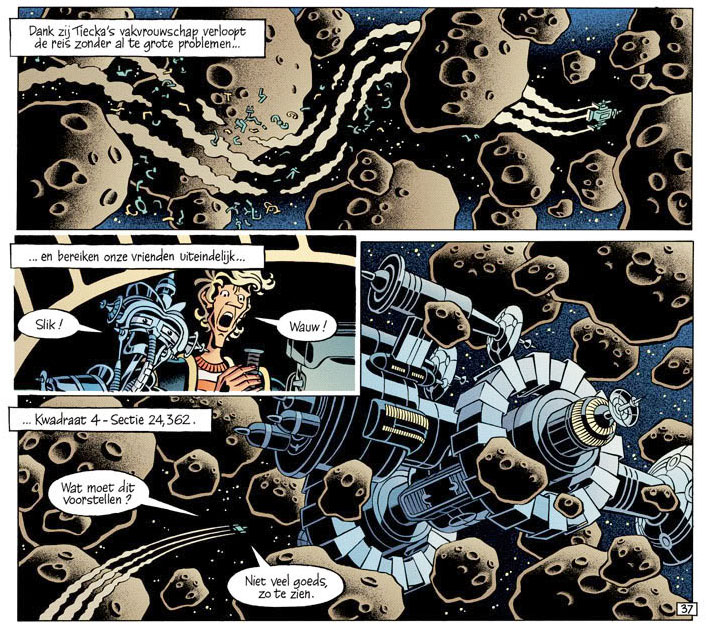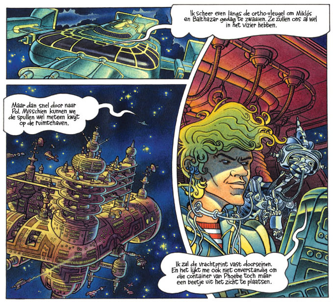 After his retirement from teaching, Vos returned to creating comics, for the occasion creating the space hero 'Jack Slender'. A cynical antihero in the spirit of classic sci-fi pulp stories, Slender gets caught up in all sorts of adventurous entanglements along with his robot sidekick Pépé and girlfriend/mechanic Tiecka. In 2007, the first 44-page episode 'De Quark-Generator' was serialized in the comic magazine MYX, and then published in a 2008 comic book by Orgcomicart. A second volume, 'Kwadraat Vier' (2013), was written by Willem Ritstier and published by the Flemish Comics Guild. 'De Amora Excursie', a final short story with Jack Slender written by Herman Roozen, appeared in the Summer of 2014 in Zone 5300 magazine.