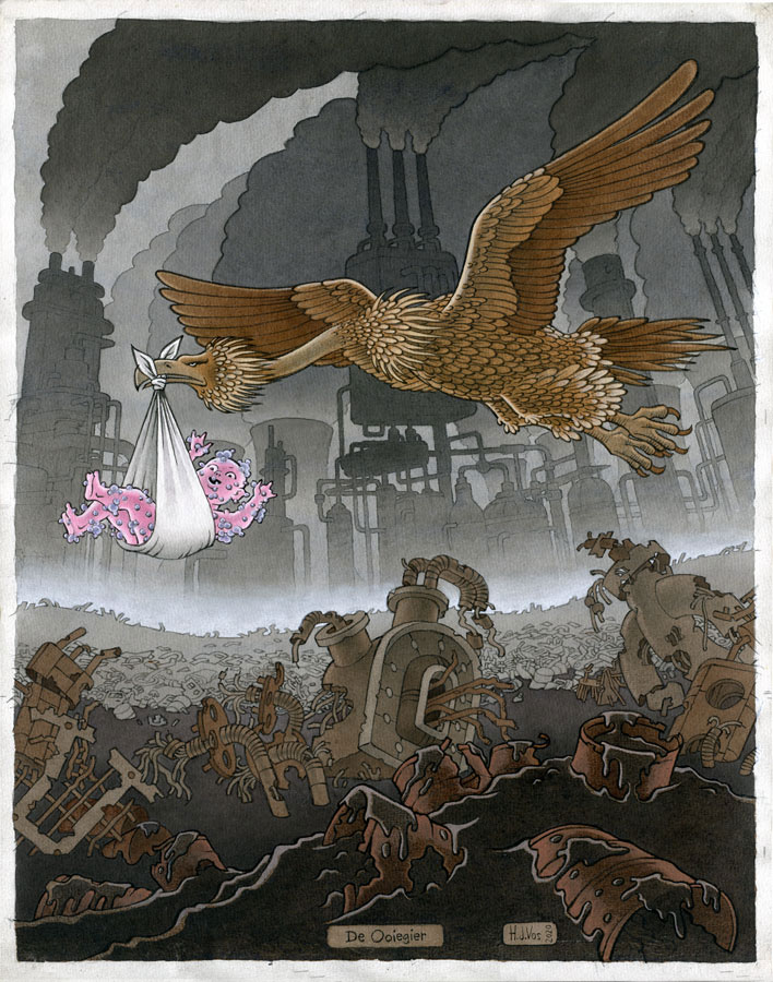 Hendrik Jan Vos was born in 1946 in Dordrecht, The Netherlands, and educated at the Academy of Fine Arts in Arnhem. Between 1970 and 2006, he was a teacher at this academy. In addition, he has been active as an illustrator and occasional comic artist. An artist with a fascination for pulp and bizarre science fiction, Vos has named Willy Vandersteen, Edgar Pierre Jacobs, Richard Corben, Tanino Liberatore and Enki Bilal as important influences on his work.