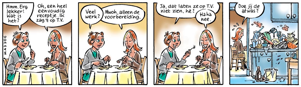 'Lisa en Lola'. Translation: "Hmm, delicious! What is it?' - 'Oh, a simple recipe I saw on TV.' - 'A lot of work?' - 'Mwoh, only the preparation.' -'Yes, they don't show that on T.V.' - 'Haha, no. Will you clean the dishes?'.