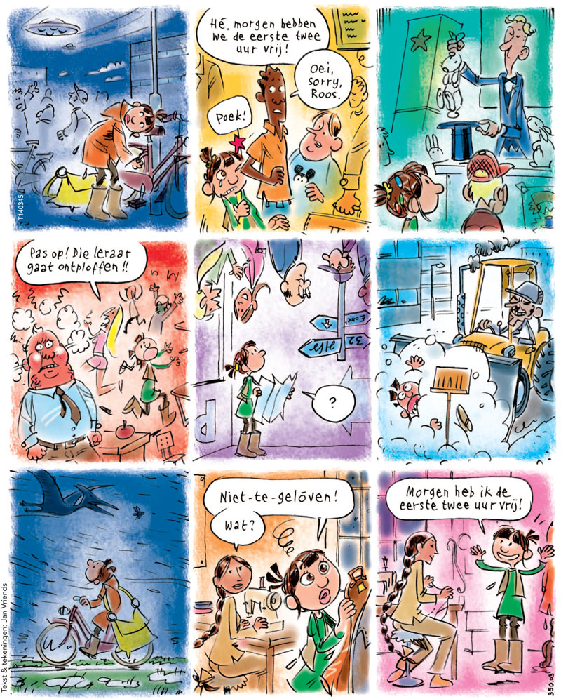 Since 2007, Jan Vriends is one of the main authors for Sanoma's girls' magazine Tina. His best-known creation is 'Roos Vink', an early teen who regretfully just left primary school and now has to find her way during her first year of high school. Unfortunately for her, comic characters never age. To this day, the poor girl continues to be confronted by complex corridor mazes, unpronounceable school subjects, gruesome bicycle tours with an immense school bag, bullying senior students and other atrocities in a freshman's life. Her main opponents are her sadistic drawing teacher, the school janitor, whom she mockingly calls "Snotje" ("piece of snot"), and her terrifying admirer Pieter Brillewieter. She however finds some comfort in her best friend Alana and her loving family.