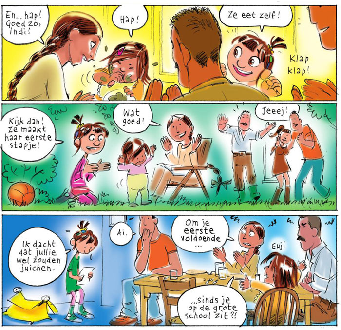 'Roos' (Tina #38, 2012). Contrary to her baby sister, who eats and walks by herself for the first time, nobody in the family cheers when Roos gets her first good grade in elementary school.