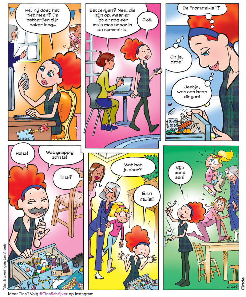 'Tina', written and drawn by Jan Vriends (Tina #7, 2018). Translation. Tina: "Hey, it doesn't work anymore. The batteries must be low." Mother: "Batteries? No, we're out of them. But there is a mouse with wire in the junk drawer." Tina: "The junk drawer? Oh yes, this one! Oh gosh, what a bunch of stuff. Haha. Funny thing, such a drawer." Publisher Joan: "Tina? What do you have there?" Tina: "A mouse! Well, look here!"