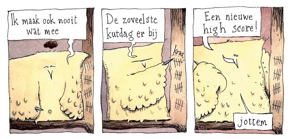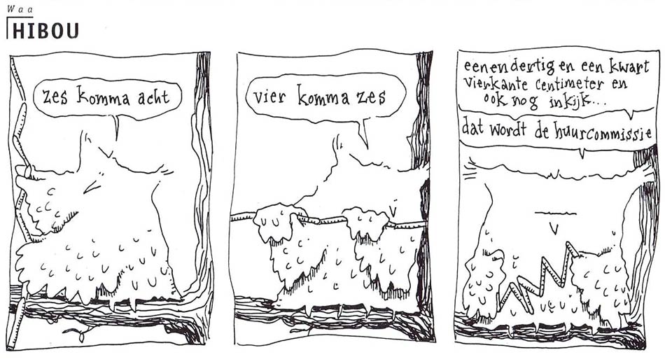 Van der Waa's best known comic, 'Hibou' (1995- ), also appears in Zone 5300. It's a three-panel gag comic about a slightly cynical and stubborn owl. His name, 'hibou' is the French word for owl.