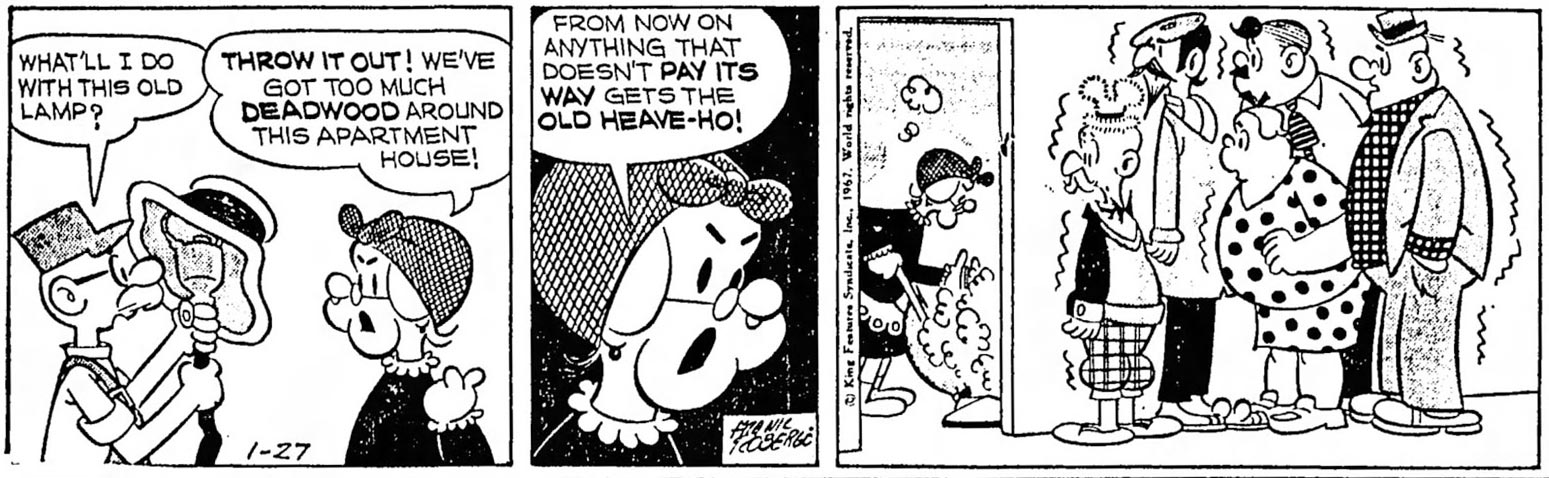 Having learned from past experience with 'Beetle Bailey', Walker tried a change of setting. On 22 February 1961, Mrs. Fitz decided to stay at a farm for a while, which opened the gates for various hillbilly jokes. Two months later, on 10 April, the series changed its title to 'Mrs. Fitz' and had her marry Linseed the janitor. The newlyweds promptly left for Florida, where a new cast of recurring characters was introduced. Mrs. Fitz and Linseed met a retired ferry captain and his wife, two children named Trinket and Albert, Barf the teenager and a self-conscious cat called Mercedes. Walker and Roberge kept the setting in this locale for two years until Fitz and Linseed moved back to their apartment, taking Barf with them to assist Linseed. All these changes could not conceal that the series ran out of steam. Some episodes occasionally feature "off model" art, hinting at a possible ghost artists whose identity remains unknown, or Roberge possibly became less interested in the series. 'Mrs. Fitz's Flats' ended on 28 October 1972.
