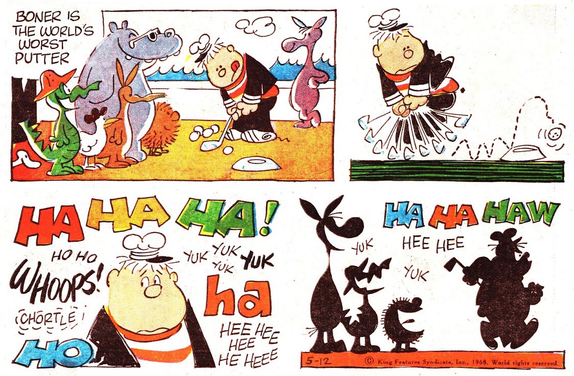 On 11 March 1968, Walker launched 'Boner's Ark' (1968-2000), a gag comic about a sea captain, Boner. Just like Noah, Boner travels the ocean with a large group of animals. It was never explained why there had been an enormous flood, nor why Boner only brought one animal of each species along.  Nevertheless, they kept sailing for a solid 32 years. Contrary to most of Walker's other long-running series, 'Boner's Ark' initially wasn't a huge success. He correctly assumed it had something to do with the recurring cast. Originally, new animals appeared in every episode. After a while, he picked out the characters which had comedic potential and dropped all others. Boner remained the only human on board. His animal passengers were restricted to just nine: Aarnie the aardvark, Duke the penguin, Rex the Tyrannosaurus, Cubcake the koala, Priscilla the Pig, Dum-Dum the gorilla and a duck whom everyone refers to as "The Doctor", since he is the ship's medical aid. Lookout the giraffe is the literal look-out who searches for new land. Also on board is an unnamed hyena who frequently complains about whatever irritates him about the ship.
