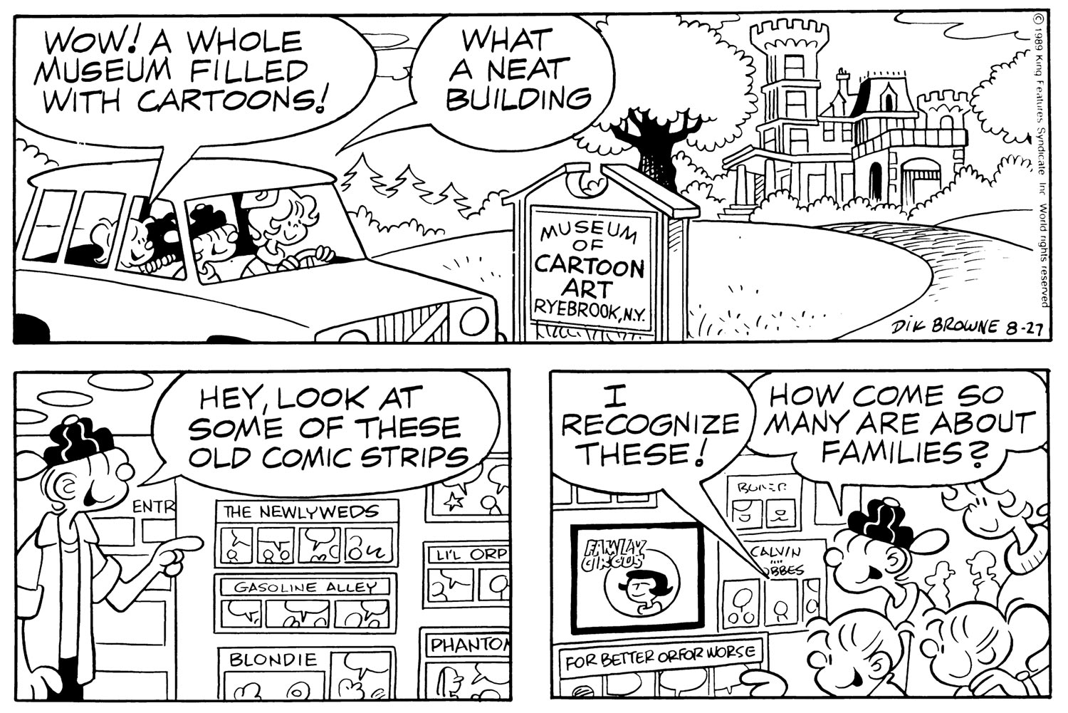 The Flagstone family visited the National Cartoon Museum on 27 August 1989 ('Hi and Lois', drawn by Dik Browne).