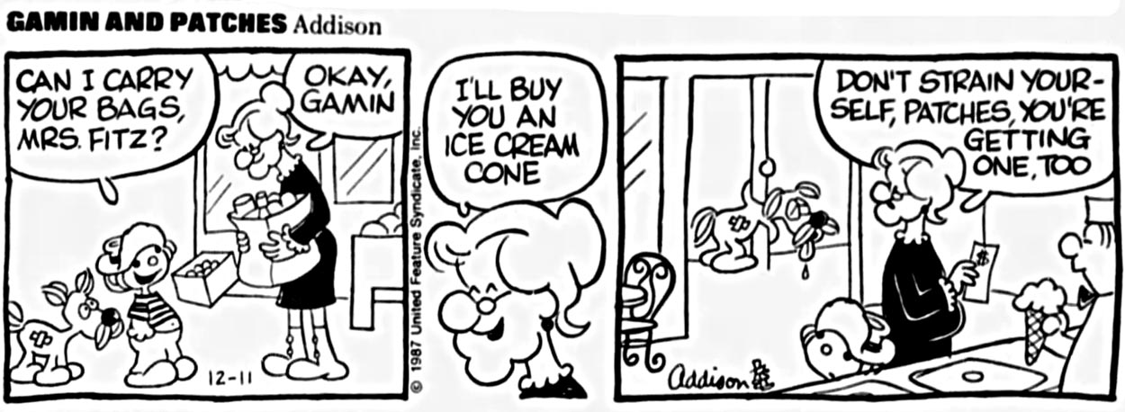 Walker's final personal project was 'Gamin and Patches' (1987-1988), which wasn't distributed by King Features but by their rival United Feature Syndicate. The series debuted on 27 April 1987 and revolved around a homeless boy, Gamin, and his mustached dog Patches. Walker had classic literary characters in mind like Hector Malot's 'Rémy', Charles Dickens' 'Oliver Twist' and Mark Twain's 'Huckleberry Finn' and happy-go-lucky comic characters such as Frederick Burr Opper's 'Happy Hooligan' and Clarence D. Russell's 'Pete the Tramp'. He assumed Gamin would charm readers in the same way. Unfortunately the general audience looked at Gamin with pity, more in line with Harold Gray's 'Little Orphan Annie' and Ed Verdier's 'Little Annie Rooney'. Even though Walker kept the tone of his comic happy and carefree, people still couldn't see the comedy in a poor young boy who had to live on the street, and the series was canceled after a year. Walker drew every episode personally, with assistance of Bill Janocha, who later ghosted the artwork. He signed them with his pseudonym "Addison" and added a tiny drawing of a walking man next to his signature, as a pun on his last name. One other newspaper comic Walker occasionally wrote gags for was 'Bringing Up Father', originally created by George McManus, but continued from 1981 on by his 'Boner's Ark' companion Frank Johnson.