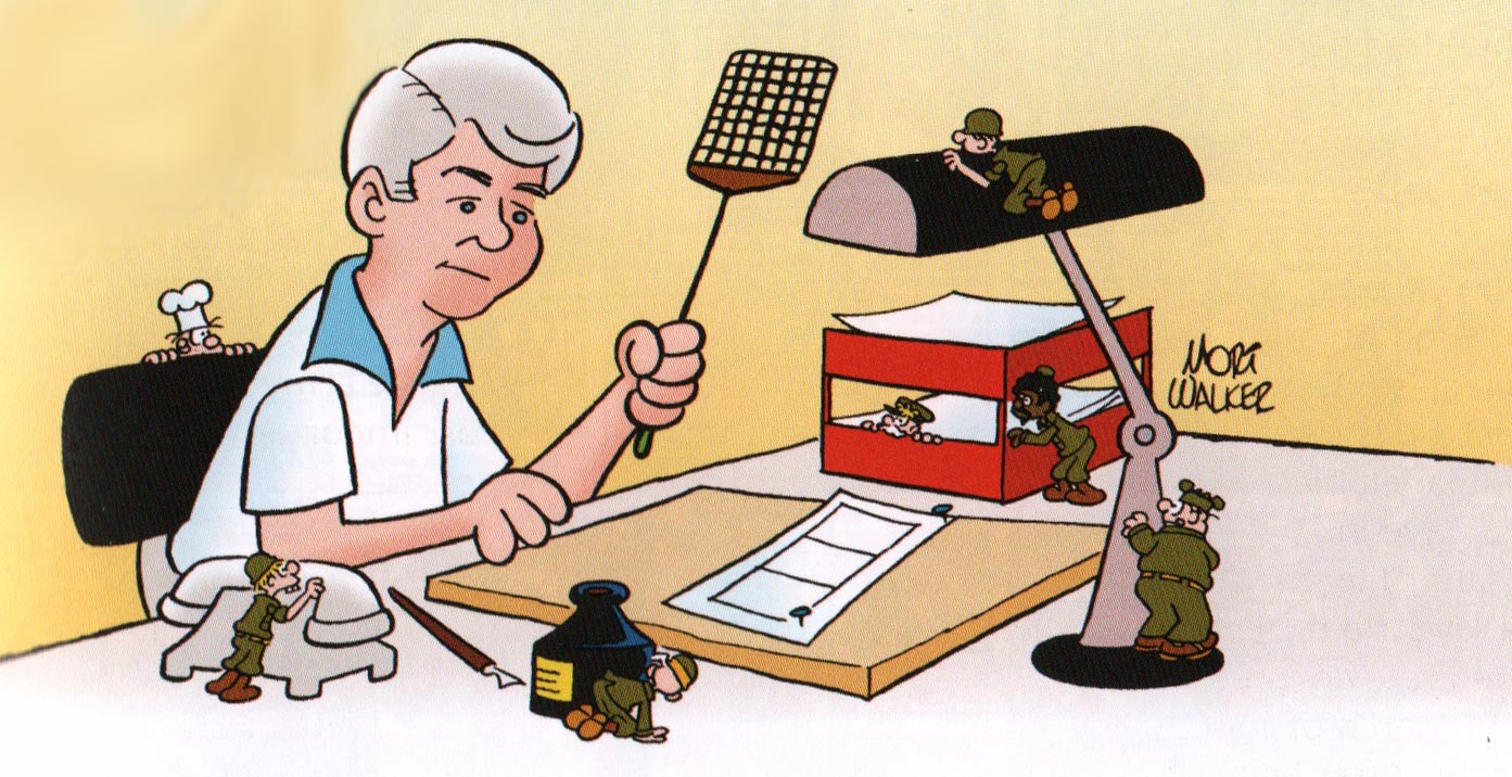 Mort Walker was one of the most productive and longest-running comic artists and writers of all time. Starting off at age 13 and continuing until age 94, though strictly as a writer and creative advisor, his career lasted over 80 years. In terms of age he was only surpassed by Al Jaffee, who was not only two years older than him and had an uninterrupted career, but also only retired at age 99. Walker, on the other hand, went through times when he couldn't publish, like his army years. Another distinction is that Jaffee has always drawn his comics personally, while Walker eventually solely concentrated on writing, lettering and making the preliminary sketches for new episodes, while his assistants inked and made the finished art. Nevertheless, Walker's studio remained a family business throughout the decades, grouped under the company name Comicana, Inc. Walker, his sons and assistant Jerry Dumas all prepared gags on their own, then sat together each month to read them all through. Good gags were given high grades. Gags others didn't find funny or weren't instantly understandable were turned down, sometimes to be reworked later. This artisanal creative collaboration provided a more intimate atmosphere which likely helped the production to be more a labor of love than a soulless factory.
