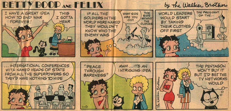 Under the collective signature "the Walker brothers", Greg Walker and his brothers Brian, Neal and Morgan produced the 'Betty Boop and Felix' strip between 19 November 1984 and 31 January 1988. While Brian and Morgan did the gag writing, Neal and Greg Walker were responsible for the strip's artwork. Based on an original idea by their father, the unusual newspaper comic starred both Max Fleischer's flapper girl Betty Boop and Pat Sullivan and Otto Messmer's 'Felix the Cat'. Walker came up with the idea after reading a book about the history of animation. He felt that Betty and Felix were such great graphic characters that they ought to be revived. For the strip, the pair were recast in different roles. Betty was now a housewife, with Felix as her pet. Much like Charles M. Schulz's 'Snoopy' and Jim Davis' 'Garfield', Felix never spoke, but communicated his lines through thought balloons. 'Betty Boop and Felix' was in some ways comparable to 'Sam's Strip' by Mort Walker and Jerry Dumas, in the sense that occasionally other well known animated characters had a cameo, like Fleischer's Koko the Clown and Jay Ward's Bullwinkle J. Moose. Ironically enough, the Walker brothers didn't encounter any copyright issues with these characters, but after a while King Features discovered that they didn't own the rights to Felix. From that moment on, Felix was dropped from the series, which became a vehicle for Betty alone until its cancellation in 1988.