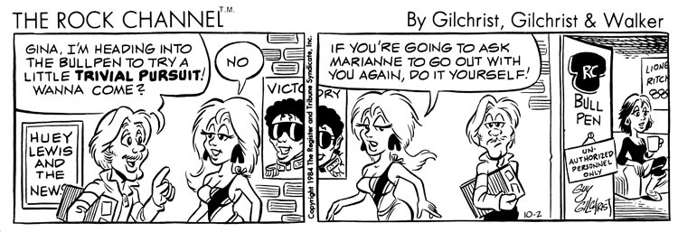 In addition to his father's strips, Greg Walker has worked on a couple of other comic projects. In 1979, he was a writer and artist of the 'Bugs Bunny' newspaper comic for a while, followed by a collaboration with Guy and Brad Gilchrist on the 'Rock Channel' strip (1984-1985), syndicated by Register and Tribune. This short-lived comic attempted to step on the popularity of the upcoming MTV channel, and featured a competing and low-rent music video television station. Greg and the Gilchrist brothers had an equal share in the gag writing, with Guy Gilchrist providing the artwork. Towards the end of its run, ghost artists like Klaus Nordling and Gill Fox took over most of the art chores.