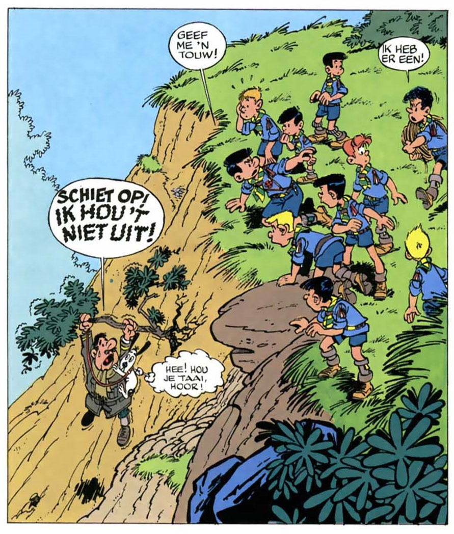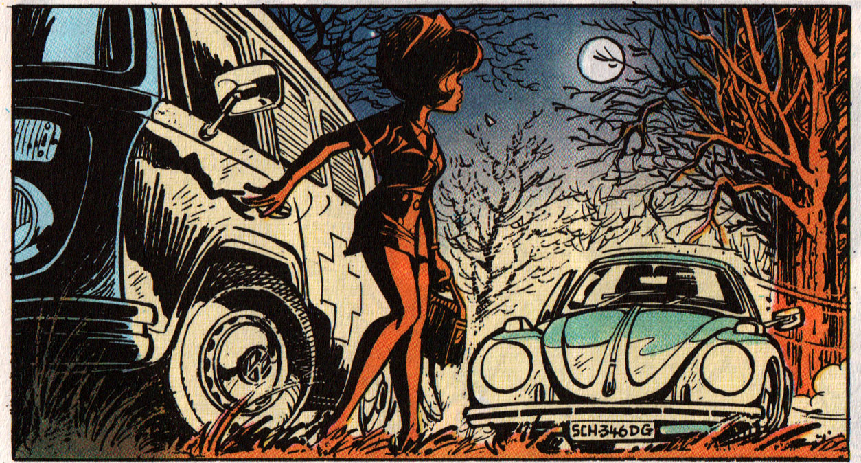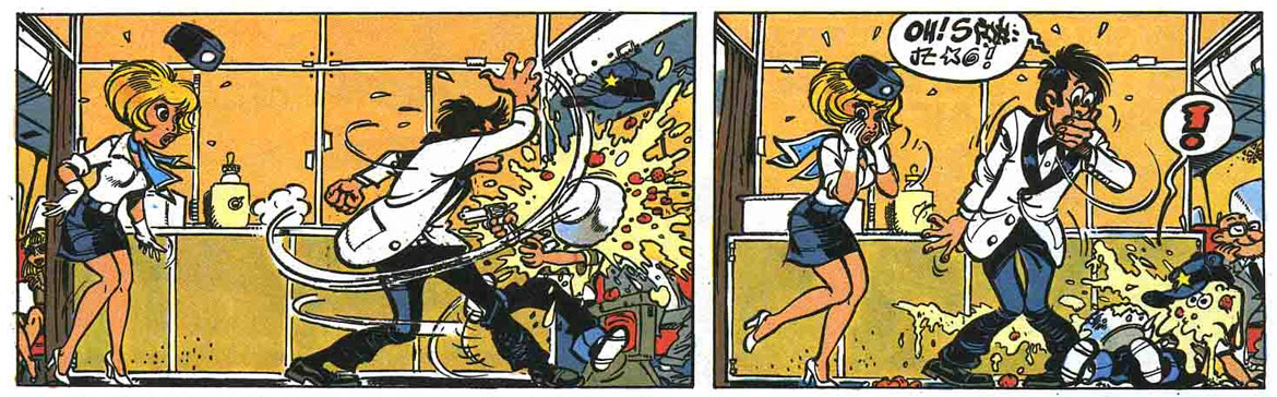 Walthéry has always enjoyed drawing caricatures of his friends and colleagues in his pages. Examples are Victor Hubinon as an aviator in 'Les Nomades du Ciel' (1988) and Dany in 'La Veuve Noire' (1997). A more over-the-top utilization of this hobby was the episode 'Natacha et les Petits Miquets' (1978), in which the entire art staff of Spirou magazine had a starring role. On occasion, Walthéry also gave Belgian politicians cameos, such as Elio di Rupo and Louis Michel, who are cast as gangsters in 'La Mer des Rochers' (2004). Another remarkable episode was 'L'ile d'Outre-Monde' (1983, written by Wasterlain), in which Natacha and Walter are stranded on a deserted island. Walthéry could indulge in drawing his sexy heroine in scarcely clothed situations, while Will provided the attractive island settings. Although the 'Natacha' stories continued to appear in Spirou on a regular basis until 1997, Walthéry had moved his album collection from Dupuis to Marsu Productions after the thirteenth album, in 1989. In 2006, 'Natacha' returned to regular serialization in Spirou.