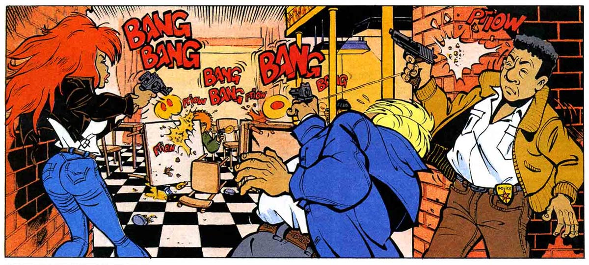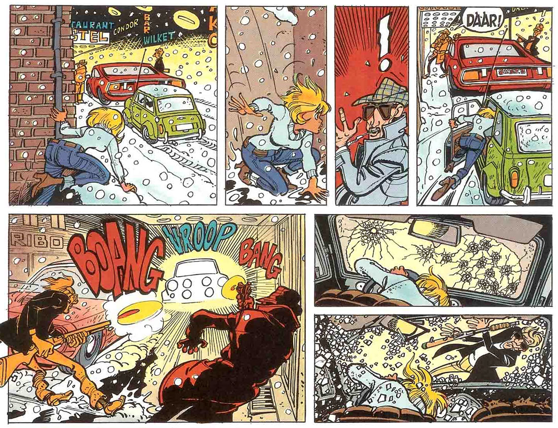 As Walthéry is notorious for being a slow worker, he has mostly worked with background artists and other contributing artists on his later-day projects. Between 1993 and 2011, he was present at publisher Lombard with 'Rubine', a series written by Mythic and drawn under supervision of Walthéry by Dragan de Lazare and later Boyan. Rubine Killarney is a red-haired U.S. policewoman of Irish descent, who lives in Chicago. The character was inspired by the TV series 'Lady Blue' (1985-1986), which also stars a red-haired policewoman in this city. Rubine's father is a sheriff from whom she inherited her crime-fighting ambitions. While Rubine started out as a police officer, she also acts as a detective and is eventually promoted to inspector. Her older brother Jay is a computer specialist, whose expertise often comes in handy. Rubine's colleague at the police station is the equally attractive Shirley. A running gag is that both Jay and Shirley always try to find a "perfect partner" for Rubine, even though she is more occupied with her work.