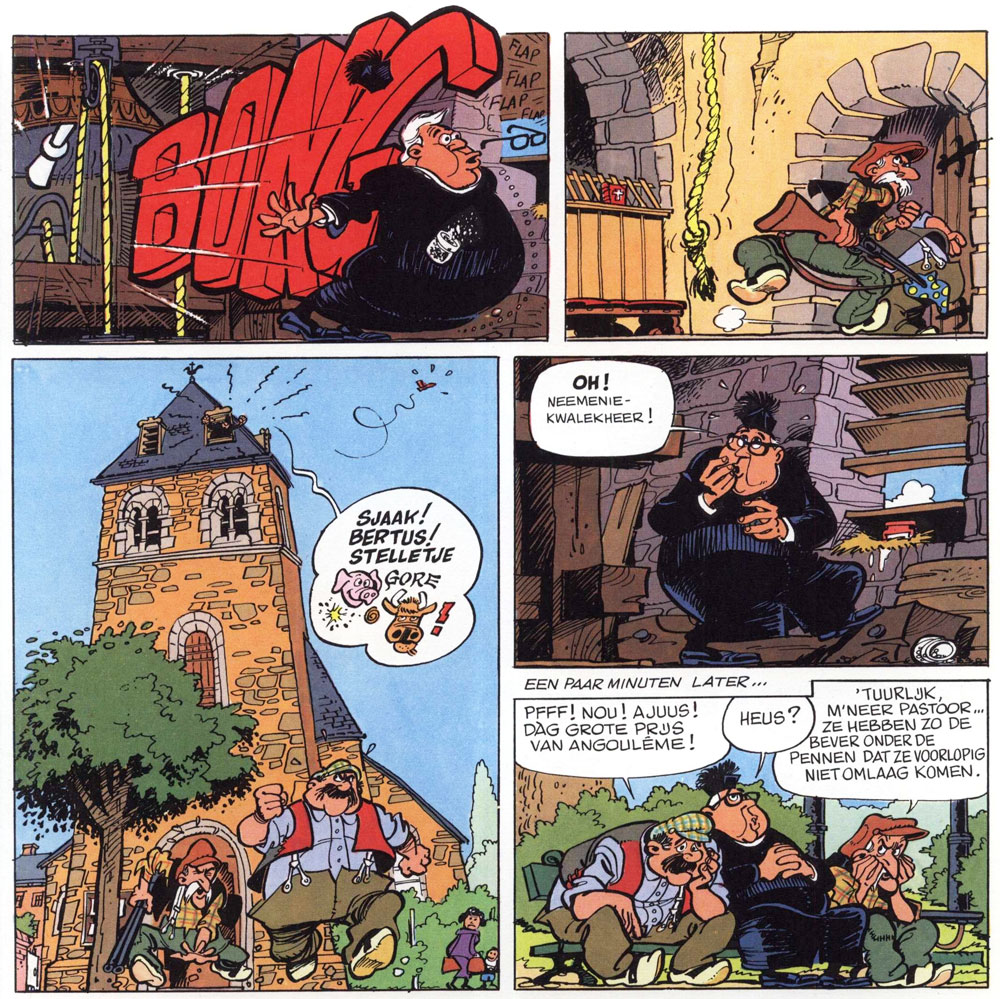 Although 'Natacha' remained his most important series, François Walthéry created a couple of other comics while working for Spirou. The first one was 'Le Vieux Bleu' ("The Old Blue", 1974-1979), about a 69-year old pigeon fancier named Jules. The character was inspired and modeled after Walthéry's own father, Jules Walthéry, who died of old age around this time period. The series is set in the real-life village of Cheratte, where Walthéry grew up. The short stories, scripted by Raoul Cauvin, appeared on an irregular basis in Spirou magazine. Tales revolve around Jules and his obsessive attempts to win pigeon fancy contests. The "Old Blue" in the title doesn't refer to Jules, as readers might assume, but to his pigeon. In reality, Walthéry's father also had a champion pigeon with that name. According to Walthéry, the exceptional bird lived until it was 18 years old, an unusual age for pigeons. In the comic, Jules has a strong rivalry with another local pigeon fancier, Achille, and the village priest, who all try to sabotage each other in order to win the championship. In 1980, 'Le Vieux Bleu' was collected in book format by Dupuis. In Robbedoes, the Dutch edition of Spirou, the feature ran as 'De Ouwe Blauwe'. A special edition was published in the Liège dialect. One of Walthéry's assistants on the series was Didier Casten