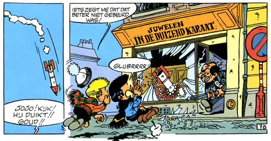 Among Walthéry's early assignments was drawing 'Jacky et Célestin', a humor/adventure series created in 1960 by Peyo and Will for the newspaper supplement Le Soir Illustré. After four episodes drawn by Will and Jo-El Azara, Walthéry was handed art duties. His first story, 'Vous Êtes Trop Bon!' (1963-1964, script by Peyo and Vicq) and was followed by 'Casse-Tête-Chinois' (1964-1965, script by Gos and Derib), 'Sur la Piste du Scorpion' (1965-1966, script by Peyo and Gos) and 'Le Chinois est Rancunier' (1966-1967, script by Peyo, Gos and Walthéry). Walthéry drew most of 'Casse-Tête-Chinois' and the beginning of 'Sur la Piste du Scorpion' while fulfilling his military service in Germany. Between 1966 and 1968, a final 'Jacky et Célestin' story was drawn by Francis and Roger Leloup from a script by Mittéï. Especially notable for being created by some of the top authors of European comics, 'Jacky et Celestin' was a straightforward humor adventure comic. The smart Jacky and the more reckless Célestin find themselves in one dangerous situation after another. Walthéry's stories can be largely credited with preventing the series from fading into obscurity. Between 1980 and 1985, his work on 'Jacky et Célestin' has been collected in four books in the Dupuis collection 'Péchés de Jeunesse'.