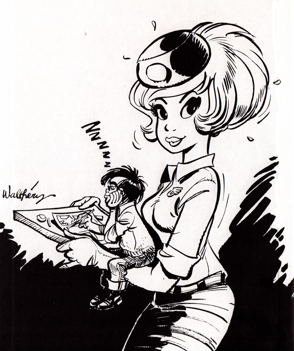In 1979, Walthéry made a special congratulation drawing to celebrate the 10th anniversary of Turk and Bob De Groot's hit series 'Robin Dubois', printed in the 4 September 1979 issue of Tintin. Walthéry was one of the contributing artists to the book 'Il Était Une Fois... Les Belges'/ 'Er Waren Eens... Belgen' (1980), a collection of columns and comic pages published at the occasion of the 150th anniversary of Belgium. He was one of several artists to make a graphic contribution to 'Pepperland’ (1980), a collective comic book tribute celebrating the 10th anniversary of the Pepperland comic store. He also appeared in 'Baston Labaffe no. 5: La Ballade des Baffes' (Goupil, 1983), an official collective parody comic of André Franquin’s 'Gaston Lagaffe'. Walthéry paid tribute to Nikita Mandryka in the collective comic book 'Tronches de Concombre' (Dupuis, 1995). Other tribute albums with Walthéry's participation were about Derib's 'Buddy Longway' (1983), Albert Uderzo's 'Astérix' (2007) and Will ('L'Arbre des Deux Printemps', 2000). In 2010, he paid homage to the work and characters created by Louis Forton in the collective comic book 'Les Nouveaux Pieds Nickelés', published by Onapratut. In Spirou issue #3778 (8 September 2010), he drew a special homage to André Geerts, who'd recently passed away.