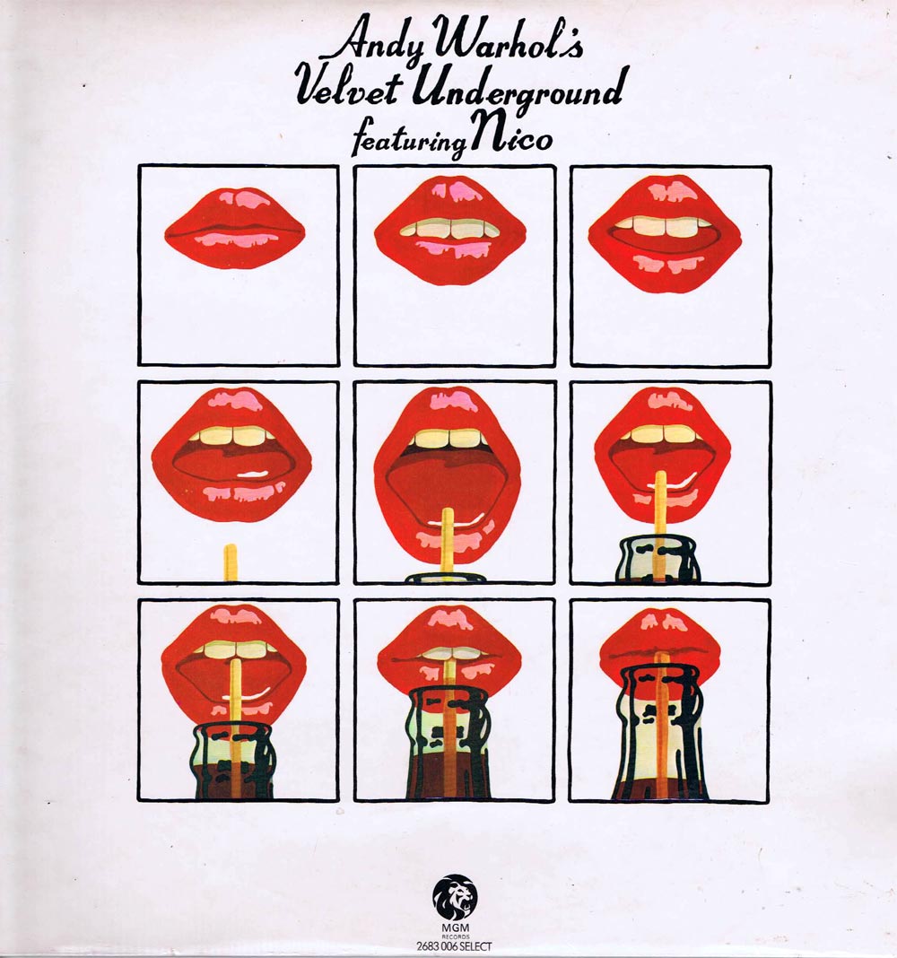 While Warhol never drew a comic strip or book, some of his album cover designs for The Velvet Underground have sequential illustrations. Inside the sleeve of 'The Velvet Underground & Nico' (1967), the iconic banana from the front cover is peeled in 12 consecutive images. The phallic shape of the banana and the peeling process bring up intentional sexual connotations. Similar innuendo in a pantomime comic format can be found on Warhol's cover for the compilation album 'The Velvet Underground Featuring Nico' (1970). The comic depicts a pair of lips taking a sip from a Coca Cola bottle through a straw. The red lipstick and the sucking gesture resemble somebody giving fellatio.