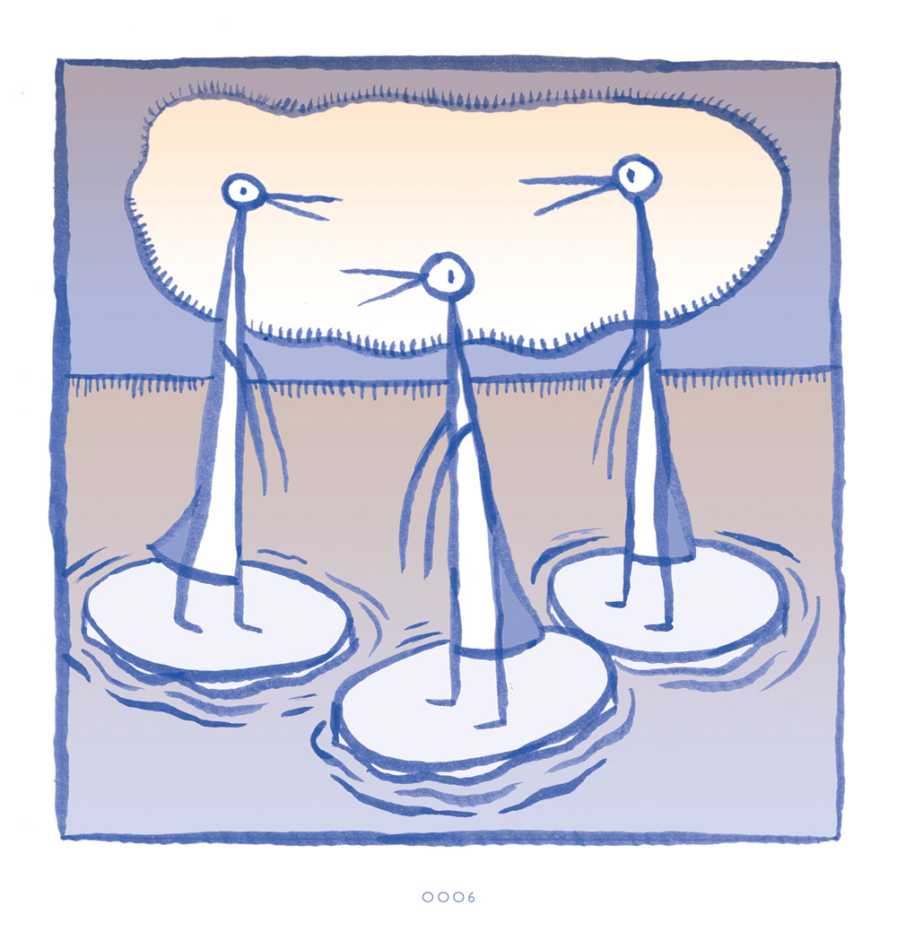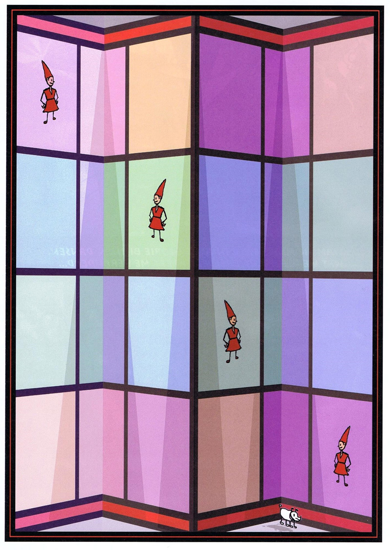 In 1995 Wasco launched 'Wasco's Comics and Stories' (1995), a new self-published title with a nod to the American comic book series 'Walt Disney's Comics and Stories'. It starred the wizard-like Tuitel, with his hourglass-shaped body and pointed hat, whose name and looks were based on a character from Piet Marée and Willy Willemse's children's book 'Ping-Pong-Ponia' (1960). Since then, Tuitel has served as the personification of the artist in exploring the laws and boundaries of the comics medium. Tuitel and his dog Phiwi walk through abstract landscapes which play with lay-outs, panel borders, narratives, chronology and other conventions of the sequential art form. Some episodes are in strip format, others full pages, but all are boundless experimentations with lines and time. Characters walk over the panel borders in all directions, narratives start in the middle of a page, pages that use color as part of the narrative... everything is possible. Episodes with more text, like the 'Tuitel vertelt' series, have a more philosophical undertone.