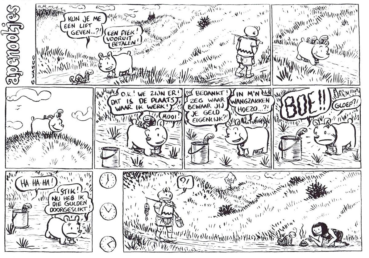 In the late 1980s Wasco began his own zine, Wasco's Weekblad. Thirteen issues of this "weekly" appeared irregularly over the course of 1989. This product of meticulous home craft was written, drawn, produced and distributed by the artist himself. He personally distributed and sold them from his bike in the Amsterdam region. Additionally, some local comics shops also sold his zines; one of these was Kees Kousemaker's Lambiek in the Kerkstraat, which always opened its doors to creators of underground and small press comic books. Wasco became part of the store's regular entourage, acquainting him with like-minded spirits such as Typex, Windig & De Jong, Erik Kriek and Joost Swarte. Wasco's Weekblad was an early showcase of the author's idiosyncratic, freestyle working method, and many of its pages were about "Wasco making a comics weekly". This self-aware publication spawned regular features like 'Krnspx de Mosselman', 'De Eenzame Ruiter' and, most notably, 'Apenootjes'.