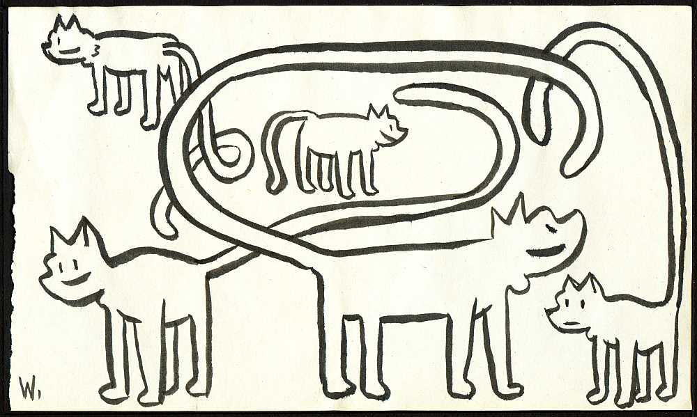 During the 2000s several of Wasco's works were cat-themed, including the booklets 'Cats by Wasco' and '1.000.000 katten' (2007). The next decade was however largely devoted to penguins, starting off with a set of 40 match boxes with penguin designs and prints, made in collaboration with Griffioen Grafiek (2011). They were accompanied by three booklets with "the extraordinary adventures" of Phillip de Pinguin. The booklets 'Philip aan zee', 'Philip krijgt een ei' and 'Philip & George', as well as Wasco's later 24 Hour Comics, featuring this penguin character all breathe the atmosphere of J.H. Koeleman's classic 'Pinkie Pienter' comics. Wasco's next penguin project was completely different: In 2018 he devoted a full month to drawing 1000 penguins in all sorts of styles and shapes, from round and comical to cubist and angular. Printed with the wider color spectrum of the Risograph printer, the resulting square-shaped book '1000 Pinguins' (Scratch 2018) was Wasco's ode to paper books and graphic arts. He returned to his favorite animals for his 2020 tear-off calendar '2020 Pinguïns' (Scratch, 2019), which featured - not surprisingly - 2020 penguins in 366 pieces of art! In turn, for the tear-off calendar of 2021 ('Poezen & katten'), he drew a copious amount of cats!