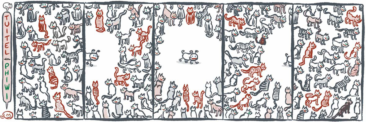 Besides 'Comics and Stories', Tuitel and Phiwi appeared in many of Wasco's self-published comic books, including a new series of Wasco's Weekblad (2006), the 'Strip Book' series (2007) the two 'Brol' books (2008), 'Vertigo' (2009), 'Het Magnetisch Park' (2009), 'Meneer Tuitel' (2009), and in the next decade, 'Minimal Comics 1' (2010), 'Meneer Tuitel Slaapt' (2010) and 'Alone' (2010). A choice selection of his small press work appeared in the hardcover collection 'Het Tuitel Complex' (2015), which was published by Scratch Books. After 25 years of creating comics, it was Wasco's first full-blown book publication with an official publisher. The pages gave an interesting look into Wasco's parallel universe, which not only comes from his own mind, but also borrows imagery from Piet Mondriaan and Hergé.