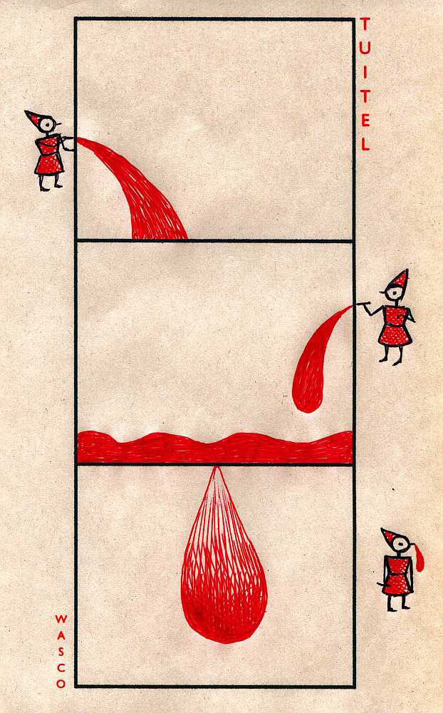 In general, Wasco works on pure DIY projects, which he prints and publishes through his Microbe label. His illustrations however also pop up in mainstream magazines, such as Vrij Nederland and VPRO Gids. For the latter, he made a weekly comic called 'Regenland' in 1997. Comics by Wasco have appeared in MUG, a magazine for welfare claimants, and most notably in Zone 5300, the alternative comic magazine from Rotterdam. He has been present since the first issue in 1994, contributing installments of his features 'Apenootjes', 'Tuitel' and 'Philip de Pinguin' over the following decades. In 2006 he participated in the comics contest held by newspaper Het Parool, where he "battled" in one of the qualifying rounds against Pieter Hogenbirk for a regular spot in the paper; the contest was eventually won by Michiel van de Pol. In 2012 Wasco, along with several other Dutch artists, contributed to 'Bommel en de Bovenbazen', a collectively redrawn version of Marten Toonder's classic 'Tom Poes' story, which was serialized in NRC Handelsblad between 2 May through 21 September 2012. Limiting himself to abstract shapes, Wasco's contributions were certainly the most daring of all!
